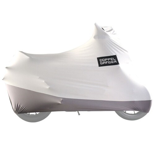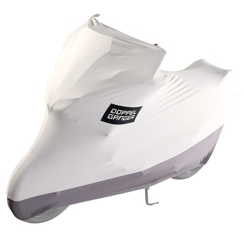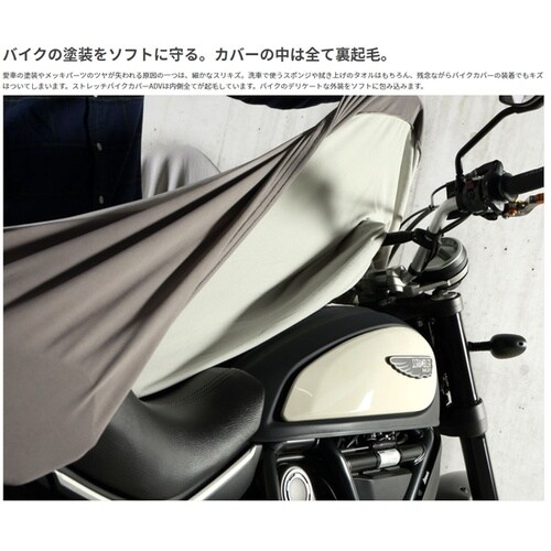ストレッチ素材でフィットするアドベンチャー対応バイクカバー。裏起毛で塗装を保護し、高強度で破れにくく、吊り下げ収納も可能。 |