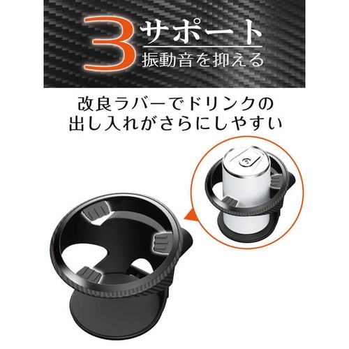 スポーティなカーボン調で上質な室内空間を演出するエアコン取付ドリンクホルダー。ラバーで安定感と振動音低減を実現し、各種缶や600mlペットボトルに対応します。 |