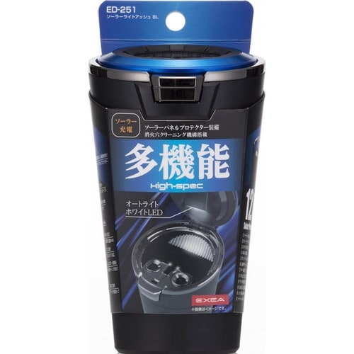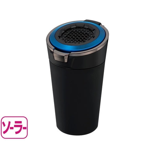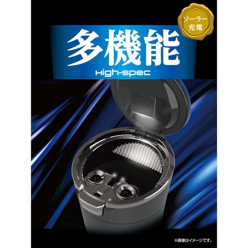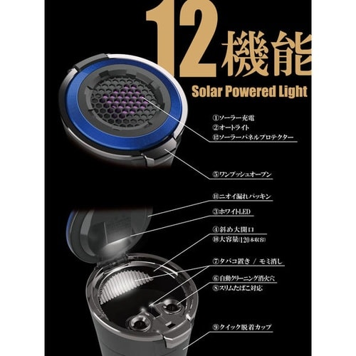 ドリンクホルダーに収まるテーパードデザインの多機能車載灰皿。ソーラーライトや自動クリーニング消火穴など、車載用に特化した12の便利な機能を備えています。