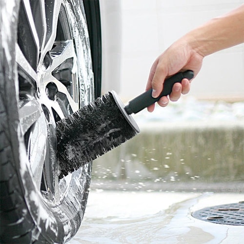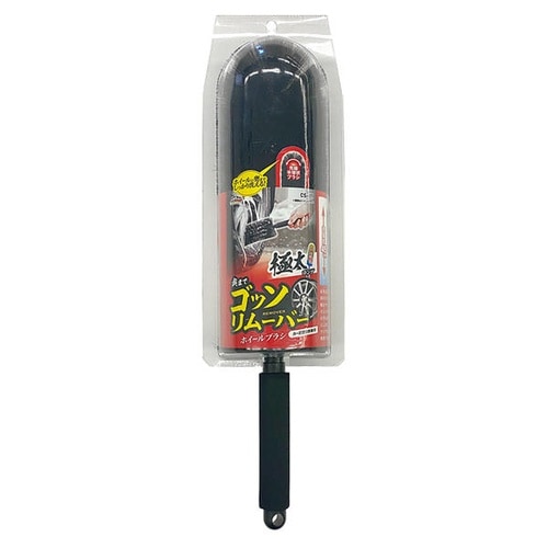 先端まで植毛されたブラシでホイールの奥まで洗えます。先割加工の中空糸で塗装面を傷つけにくく、クッション付きグリップで滑らず安心です。 |