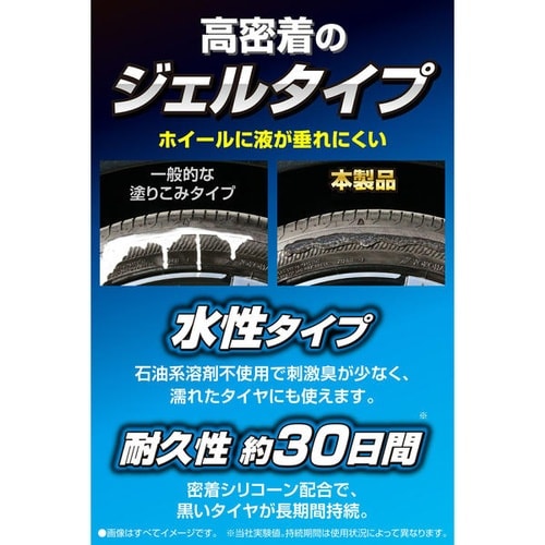 光沢度泡タイプの約2倍でタイヤが輝く塗りこみWAXです。耐久約30日、密着シリコーンで黒艶長持ち。水性ジェルで液だれしにくく、濡れたタイヤにも使用可能。専用スポンジで隙間もラクに塗れます。 |