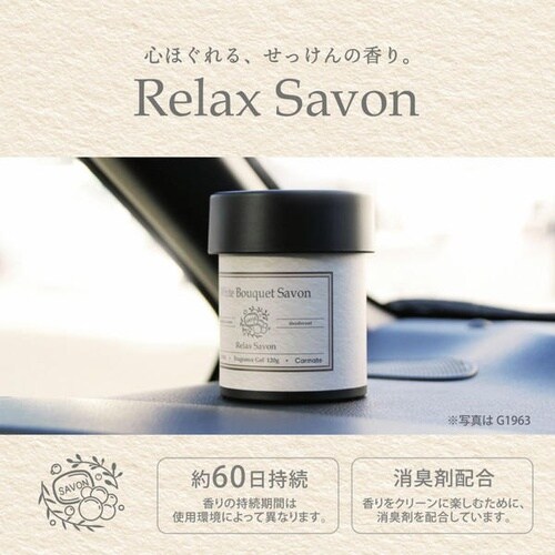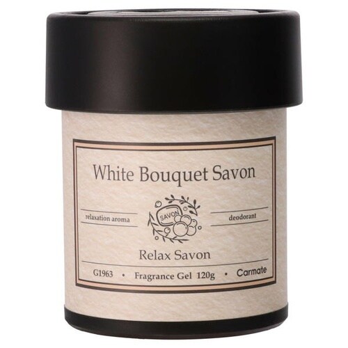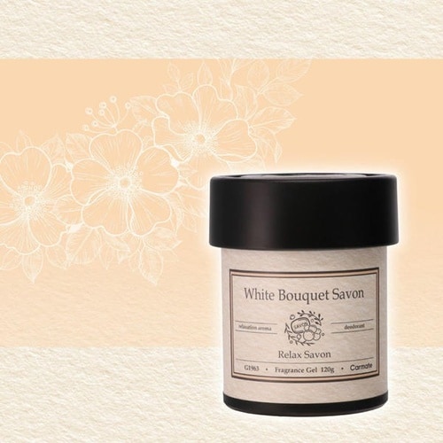 優雅なバスタイムを思わせる固形ゲル芳香剤です。こぼれず安心して使え、車内に設置可能。約60日持続し、シトラスを添えた華やかなホワイトブーケサボンの香りが広がります。 |