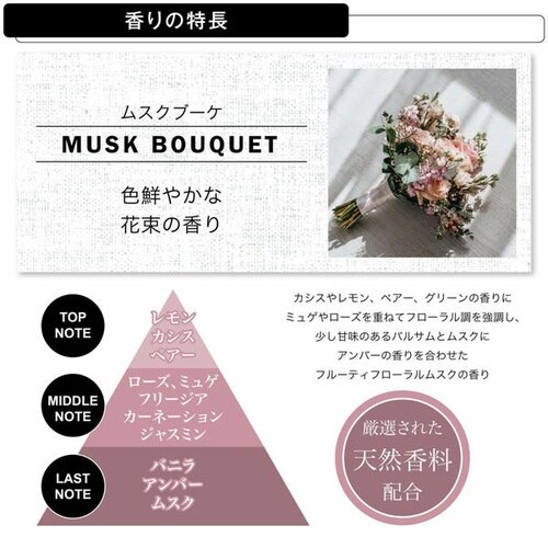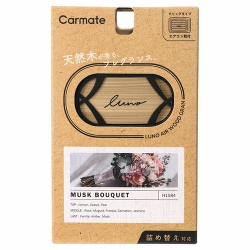 天然木を使用した上質なクリップ型芳香剤です。エアコン風で香りが広がり、消臭剤配合でクリーンに楽しめます。約30日持続し、華やかなムスクブーケの香りが広がります。 |