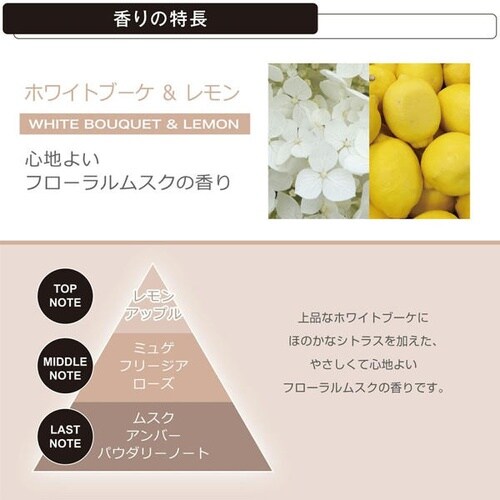 噴霧式フレグランスディフューザー専用オイル。天然香料配合で優しい香りが均一に長持ちします。ホワイトブーケにシトラスを加えた心地よいフローラルムスクが広がり、大切な時間を彩ります。 |
