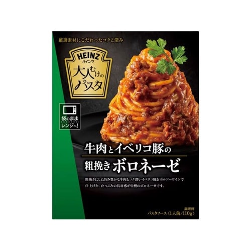 ハインツのプレミアムパスタソース。粗挽き牛肉とイベリコ豚をボルドーワインで煮込んだコク深いボロネーゼ。具材感たっぷり。 |