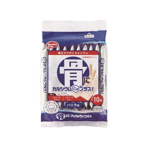 カルシウムが手軽に摂れるバニラ風味のウエハースです。2枚に500mgのカルシウムとビタミンDを配合。陳列に便利なフック穴付き。 |