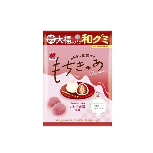 米粉を使ったソフトなとろむにゃ食感が特徴の大福のような和グミ。いちごの酸味とあんこのコクと甘みがクセになる「いちご大福風味」を 手軽にひとくちでお楽しみいただけます。 |