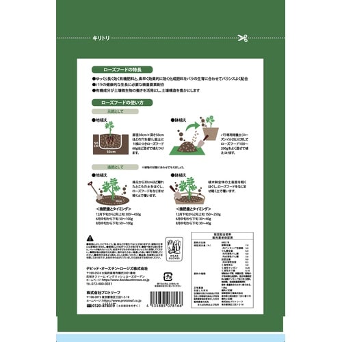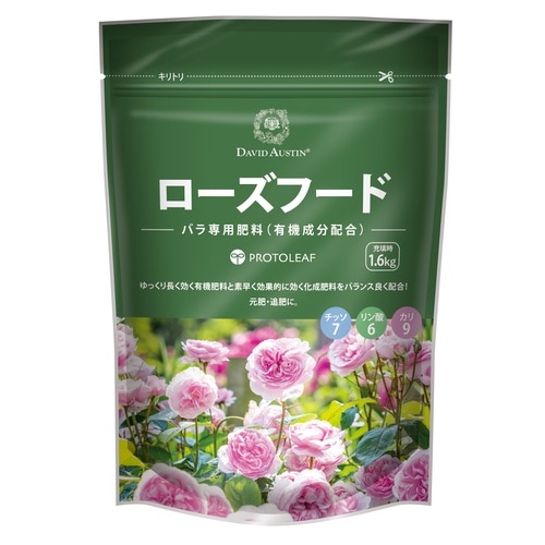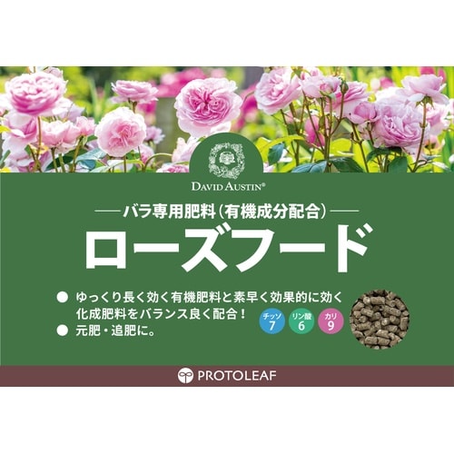 | 注意事項 | ※【特徴】歴史と技術ある企業との共同開発を行い、それぞれの植物にとって理想的な土環境を追求し、この栄養剤が完成しました!このローズフードはデビッド・オースチンと共同開発で知識と技術の結集です。原肥・追肥に。鶏ふんベースの有機配合肥料です。チッソ7:リン酸6:カリ9です。 |