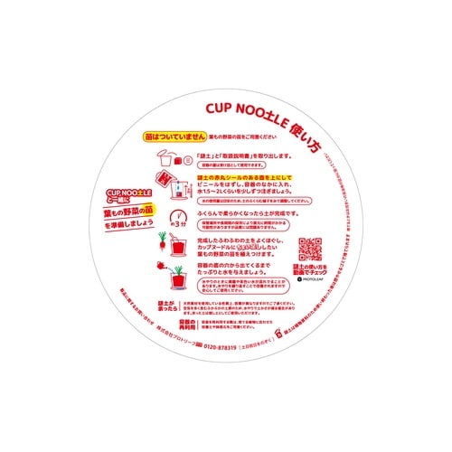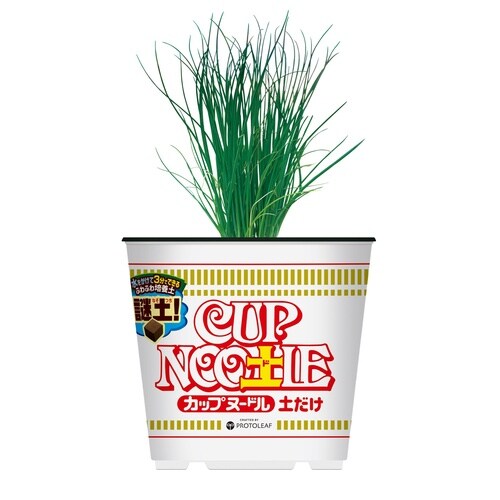 日清カップヌードルデザインの容器に、水でふくらませる培養土が入った商品。 |