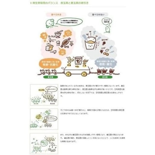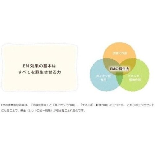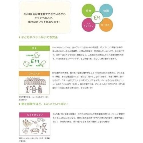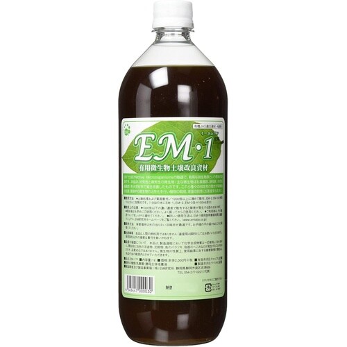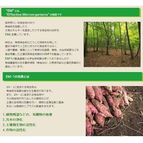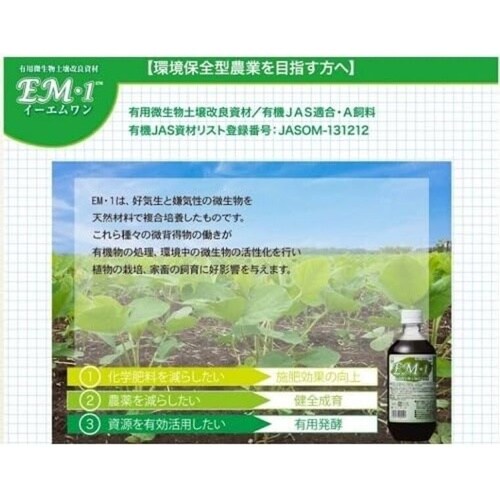 | 注意事項 | ※●環境保全型農業を目指される方へ EM1は好気性と嫌気性の微生物(主な微生物は乳酸菌群、酵母群、光合成細菌群)を天然材料で複合培養したものです。これら種々の微生物の働きが土壌中で連動し合うことで相乗効果を発揮し、土壌改良に役立ちます。●EM1を有機物とともに施用すると、乳酸菌や酵母などの発酵系微生物が働き始めます。乳酸菌は有機酸を作りだし有害微生物の増殖を抑え、有機物の可溶化を促進します。次に可溶化された養分を元に酵母がアミノ酸やアルコールを作り出します。このような微生物の連動が次々起こり、土壌中や葉面の微生物を活性化させます |