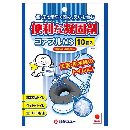 1個で水約2000mL、尿(生理食塩水)約400mLを素早くゼリー状に固めます。凝固剤には殺菌剤・消臭剤を混合しています。断水時のトイレや尿瓶等の処理に便利です。 |
