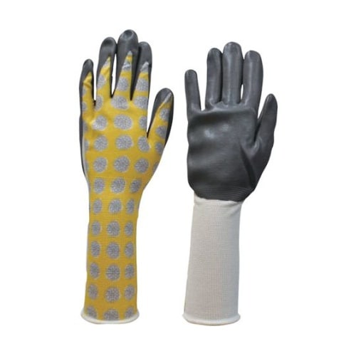 油にも強いニトリルゴムを使用し、摩耗にも優れています。背抜きタイプなので通気性に優れムレにくいです。手のひらに発泡させたゴムを使用し、高いグリップ性能を実現しています。園芸・農作業。建築・土木作業。 |