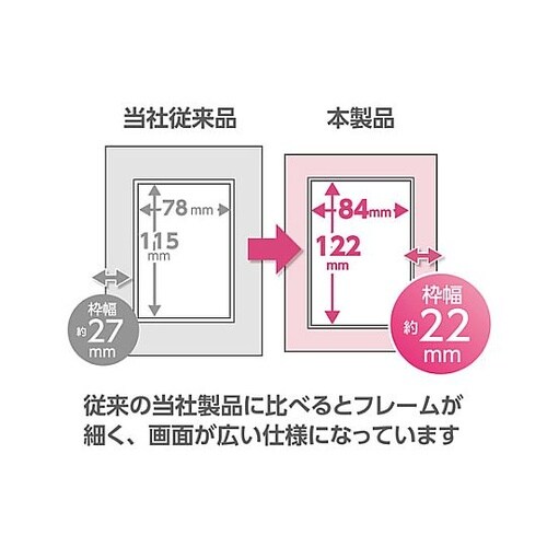 ワイドな画面とスリムな枠で写真をより引き立てるペーパースタンド枠幅が22mmで従来のペーパースタンドよりもスリムなペーパースタンド。画面サイズも広くなり、収納物をより引き立たせます。 |