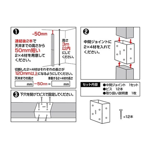 2×4材を使って、壁面を収納として有効活用!WALL TQOOL用の中間ジョイントカットした2×4材の連結に。2×4材とアジャスター、棚受けは別売りです。 |