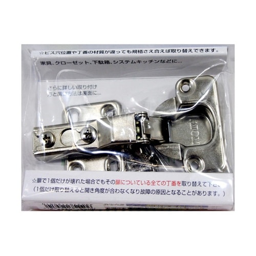 家具、クローゼット、下駄箱、システムキッチンなど用の丁番1個だけが壊れた場合でもその扉についているすべての丁番を取り替えてください。扉の上下で違うメーカーの丁番を付けると破損の原因となります。 |