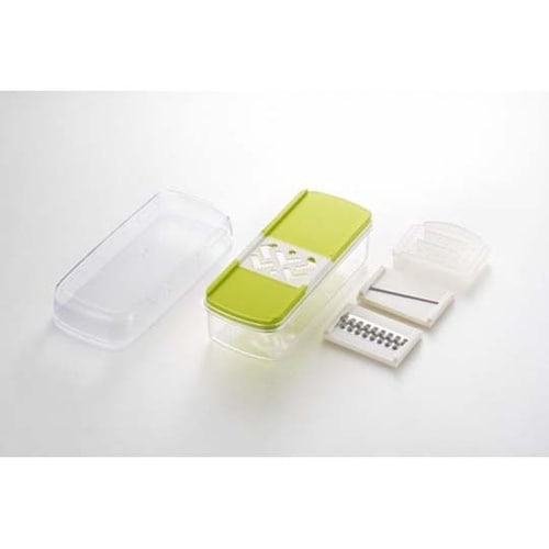 カセット式で替刃を付け替え、3通りの調理ができます。プレートには【マイクロリブ(細かな溝)】を施し、食材の切り離れを向上しました。替刃・安全ホルダーがフタに収納できるコンパクト調理器セットです。 |