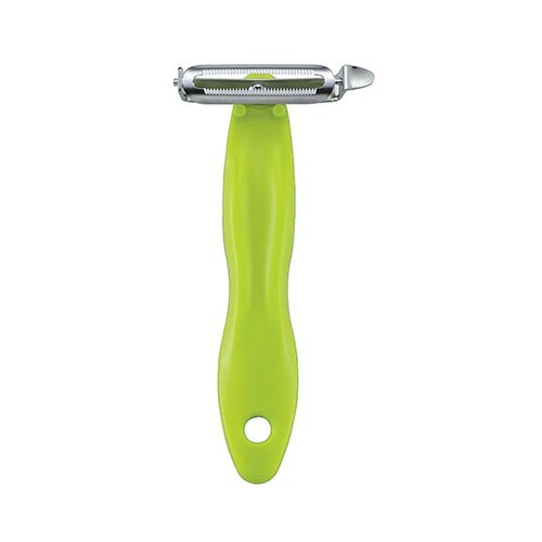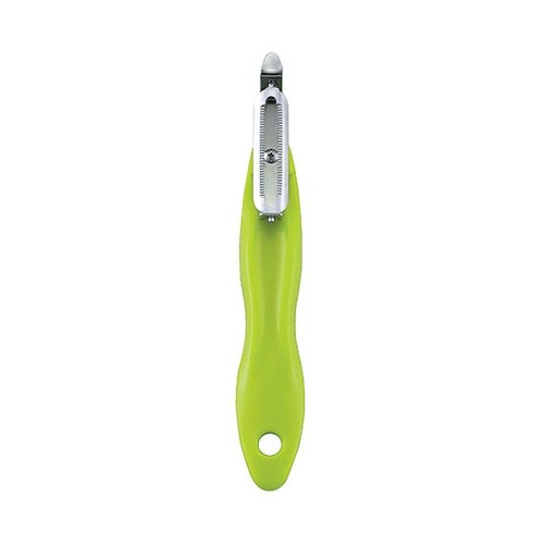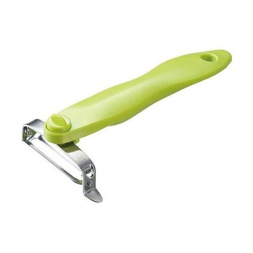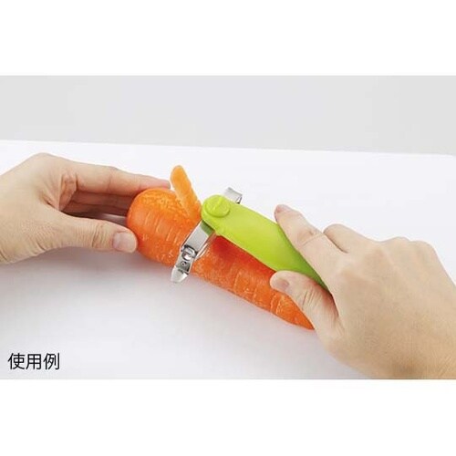ボタン操作で「縦型」「横型」には刃角が変化するベジタブルピーラー。刃にはセレーション(波刃)になっているので、刃が滑りやすい食材でも皮を引きやすくなっております。 |