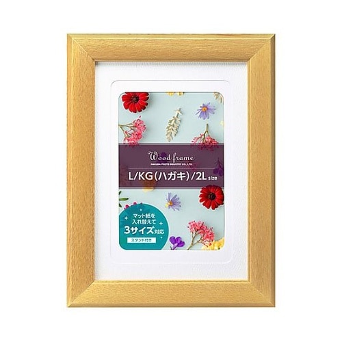 3サイズの写真に対応可能な3WAY木製カラーフレーム2Lサイズの写真の他に、付属のマット紙を使えばLサイズやKG(ハガキ)サイズにも対応します。