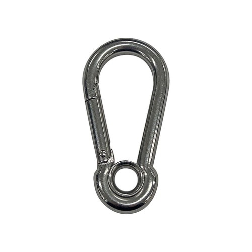 開口部を押さえチェイン・ロープ等の連結に使用します。スプリングの力で開口部は戻ります。ヘッド部分にリングが付いていますので片方の連結が外れることなく安全です。