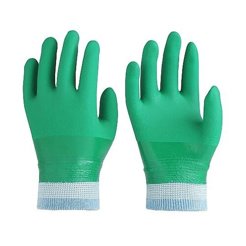 塩化ビニール製のため、天然ゴムの手袋に比べて油に強い手袋です。指、手のひらにスベリ止め加工を施しているため、グリップ性に優れています。袖口にジャージを使用しているため手首にしっかりフィットします。 |