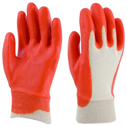 塩化ビニール製のため、天然ゴムの手袋に比べて油に強い手袋です。背抜きコーティングのため、通気性に優れています。袖口にジャージを使用しているため、手首にしっかりフィットします。 |