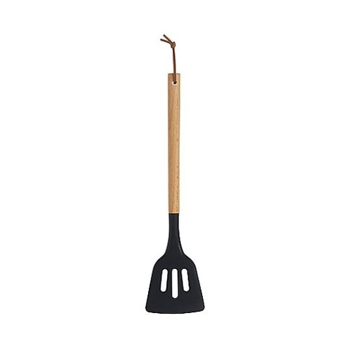 シンプルモダンなキッチンツールシリーズ。柄は手になじみやすい天然木、先端は耐熱性の高いシリコンゴムなので鍋やフライパンを傷つけにくいです。柄には吊り下げ用の紐を標準装備。