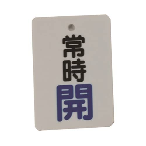 材質:アクリル | サイズ:縦65×横45mm、厚み2.5mm | 仕様等:上部中央φ4mm穴×1、四隅R加工、片面印字(背景白・常時−黒色、開−青色…