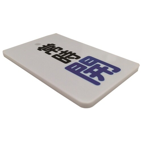上部中央φ4mm穴×1、四隅R加工、片面印字(背景白・常時−黒色、開−青色)