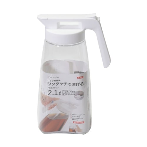 ロック解除後、ワンタッチで注げる冷水ポット。タテ置きヨコ置きどちらも可能。持ちやすく注ぎやすいハンドル形状。広口で洗いやすい。ロック機能付。 |