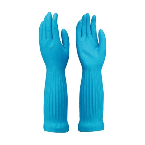 手首、袖口に絞り加工を施し、作業中のずれ落ちを防ぎます。肘下までのロングサイズで、水が入りにくくなっています。柔らかな天然ゴムと耐薬性に優れる合成ゴム(クロロプレンゴム)を配合しています。 |