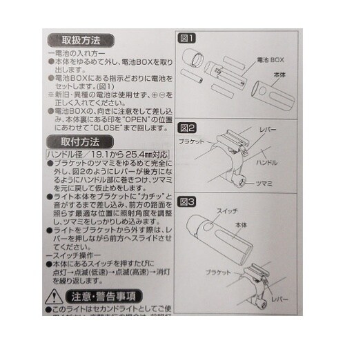 コンパクトでも中心光度約800カンデラの明るさをもち、点灯/点滅(低速・高速の2モード)切替がついたライトです。 |