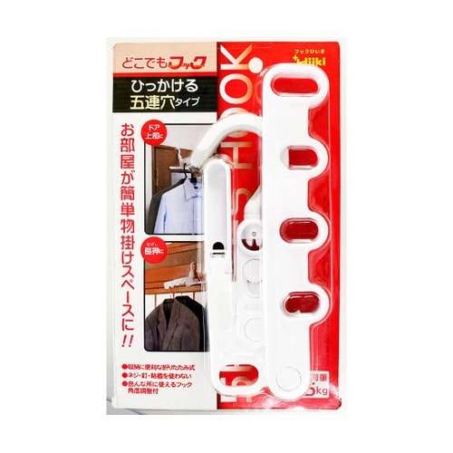 本品はネジ釘粘着を使わず、室内を物掛けスペースとして利用できる5連穴フックです。家具壁面などにキズをつけにくいエラストマー樹脂を一部使用しています。収納持ち運びに便利な折りたたみ式です。 |