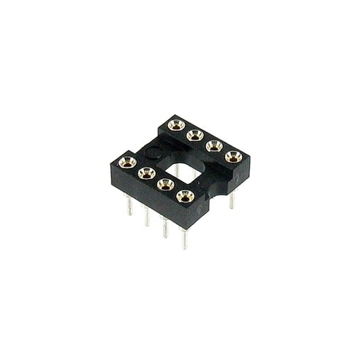 8ピンDIPIC用のソケットです。板バネ型よりも勘合が確実で高信頼です。丸ピンヘッダーや基板モジュールをDIP化する連結ソケットとも勘合します。 |