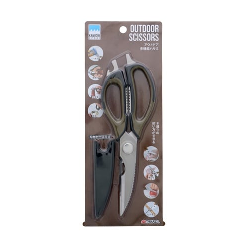 野外での調理にハサミ、殻割り、栓抜き、缶開け、うろことり、骨切り、ナイフ、皮むきに8通りの使い方!持ち運びお手入れもラクラク。 |
