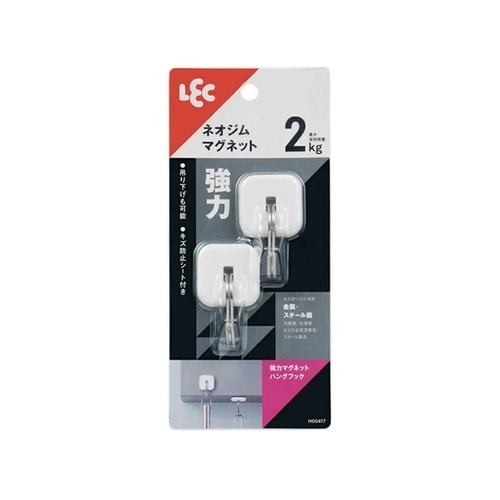 耐荷重2kgの強力マグネットフック2個入りです。従来の磁石の10倍の磁力を持つネオジム磁石を使用しています。吊り下げも可能なハングフックです。キズ防止のシート付きで安心してお使いいただけます。 |