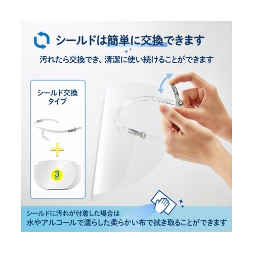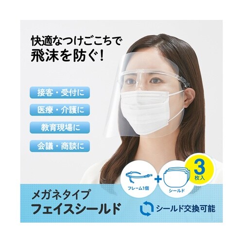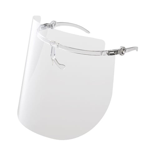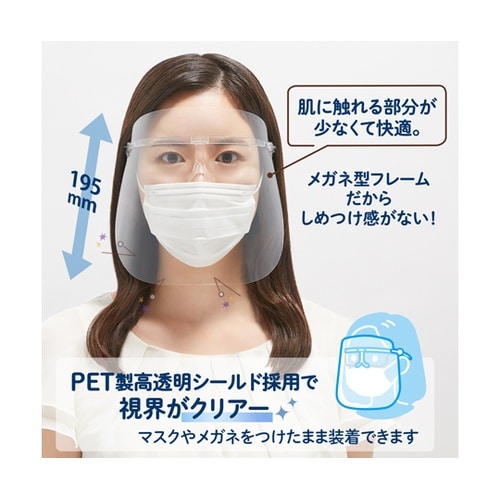 プラスのフェイスシールドシリーズ。快適なつけ心地と便利な機能を実現。メガネ感覚でサッとつけはずしができ、髪型が崩れない。肌に触れる部分が少なく、快適なつけごこち。 |