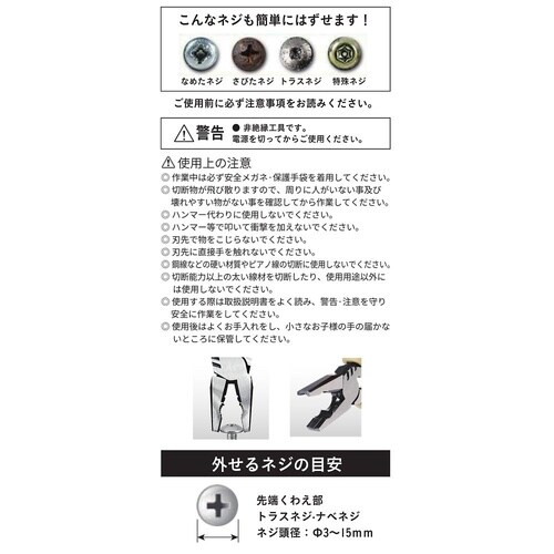潰れたネジを外す際にご使用頂けます。なめたネジ、サビたネジ、トラスネジ、特殊ネジを外す際にもご使用頂けます。※本来の用途以外で使用しないで下さい。※幼児の手の届かない所に保管して下さい。 |