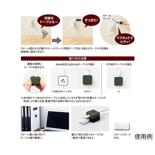 ケーブルの絡まりや断線を予防するケーブルホルダー。スチール面または付属のスチールプレートを使えばケーブルの先端を壁面等に固定できます。スチール面に貼り付けてケーブル類の整理に。 |