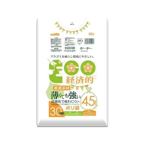 半透明のポリ袋30枚入りです。1枚あたりの容量約45Lです。カサカサとした感触が特徴的です。引っ張りに強いです。薄くても高強度で破れにくいです。 |