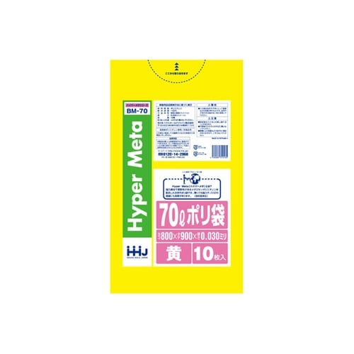黄色のポリ袋10枚入りです。1枚あたりの容量は約70Lです。表面がツルツルタイプの袋です。柔らかく伸びやすい素材が使用されており、破れにくいです。 |