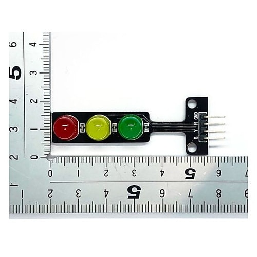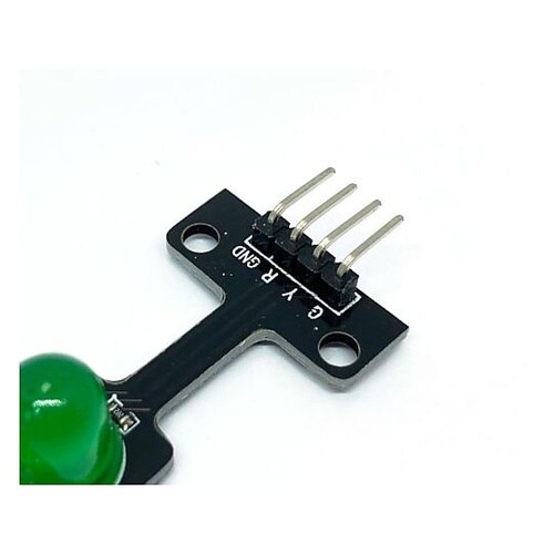 信号機を模した形の基板に、赤/黄/緑のLED3灯を配置したモジュールです。各LEDに直列抵抗(電流制限抵抗)が入っており、マイコンの出力ポートに直結できます。 |