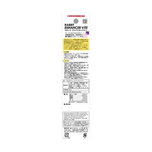ペースト状で与えやすい栄養補助食品。食欲維持と腸内環境をサポートします。天然ビタミンE・必須脂肪酸等を豊富に含む小麦胚芽油を主成分としており、うさぎ等の小動物の健康維持に役立つ栄養補助食です。 |