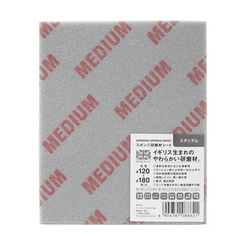 イギリス生まれの柔らかいスポンジ研磨剤です。乾式湿式両用です。エッジを損なわない表面研磨が可能です。強く押すと#120相当、弱く押すと#180相当の研磨目になります。 |