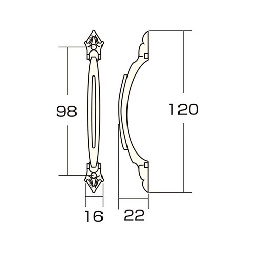 コード番号:00112746 | 材質:亜鉛ダイカスト | 取付:表木ネジ止 | ビスピッチ:98mm | 単位:1個