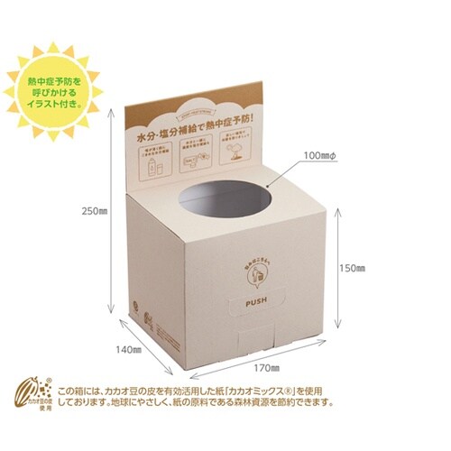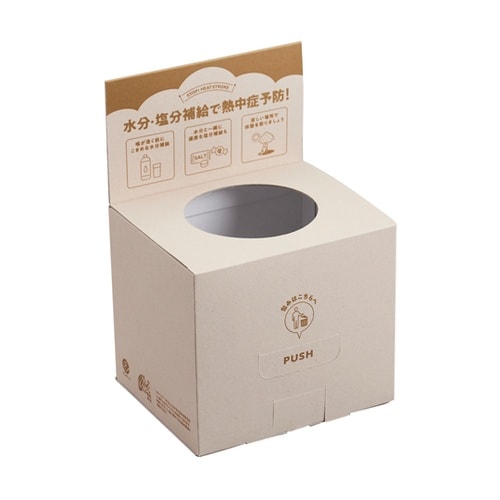スマートに収まる、コンパクトで環境にも優しい紙製の容器です。飴やタブレットなどを衛生的かつ便利に収納できる専用ケースです。熱中症予防を呼びかけるイラスト付きです。 |