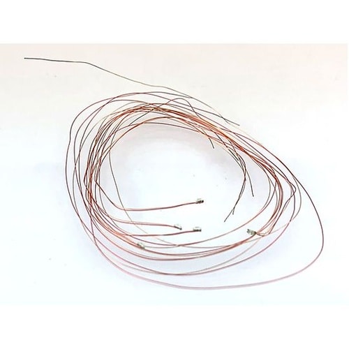 LEDにポリウレタン銅線をハンダ付けしています。リード線は、ポリウレタンの被膜で覆われているため、直接ハンダ付け出来ません。被膜を剥がすか、被膜のない先端部分にハンダ付けをしてください。 |