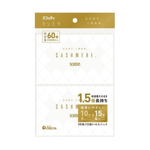 1個あたりの組数を従来の10組から15組へ変更し、取替回数を軽減。個装フィルムが6Pから4Pになり、プラスチック使用量約14%削減。厳選したパルプのみを使用し、やわらかな肌触り。 |