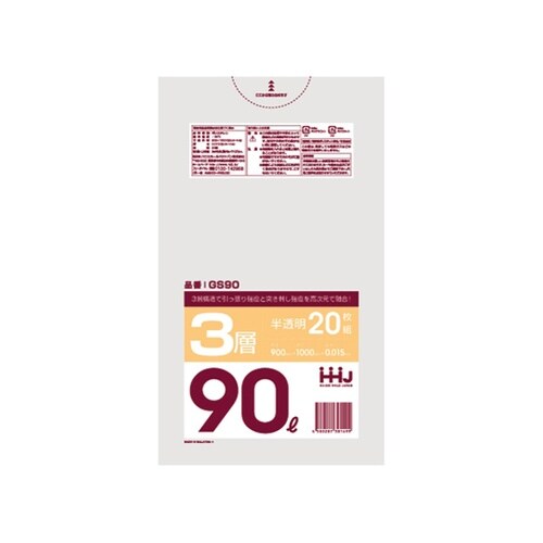 半透明のポリ袋20枚入りです。1枚あたりの容量約90Lです。伸びる素材の直鎖状低密度ポリエチレンを挟み込んだ3層の薄口ポリ袋です。引っ張りに強い高密度ポリエチレンも使用されています。 |