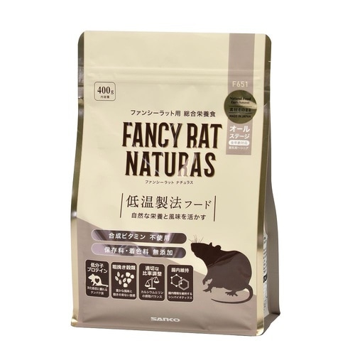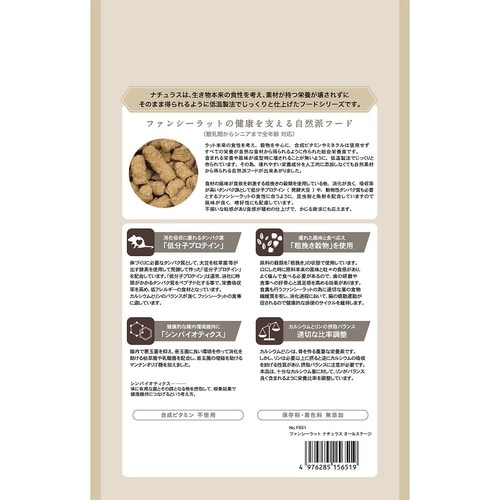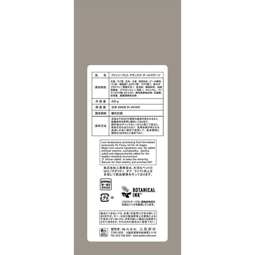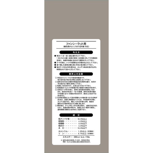 ファンシーラット本来の食性を考え、素材が持つ栄養をそのまま得られるようこだわり、低温製法で仕上げたフードです。食欲を刺激する粗挽きの穀類を使用。 |