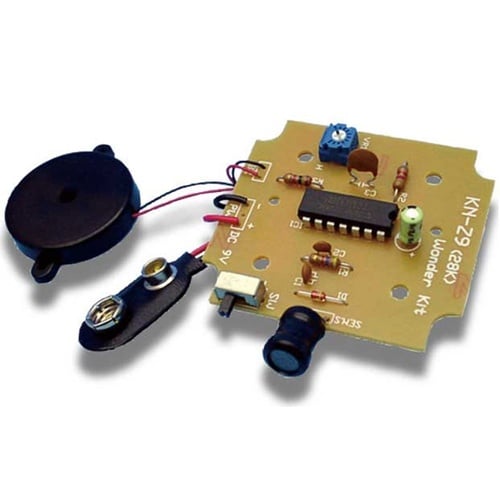 小さくてもボディチェックで使われている金属探知機と原理は同じ。ポケットに入れた100円玉を探知できる感度があります。部品点数が少なく配線パターンも太いので電子工作の入門としても適したキットです。 |